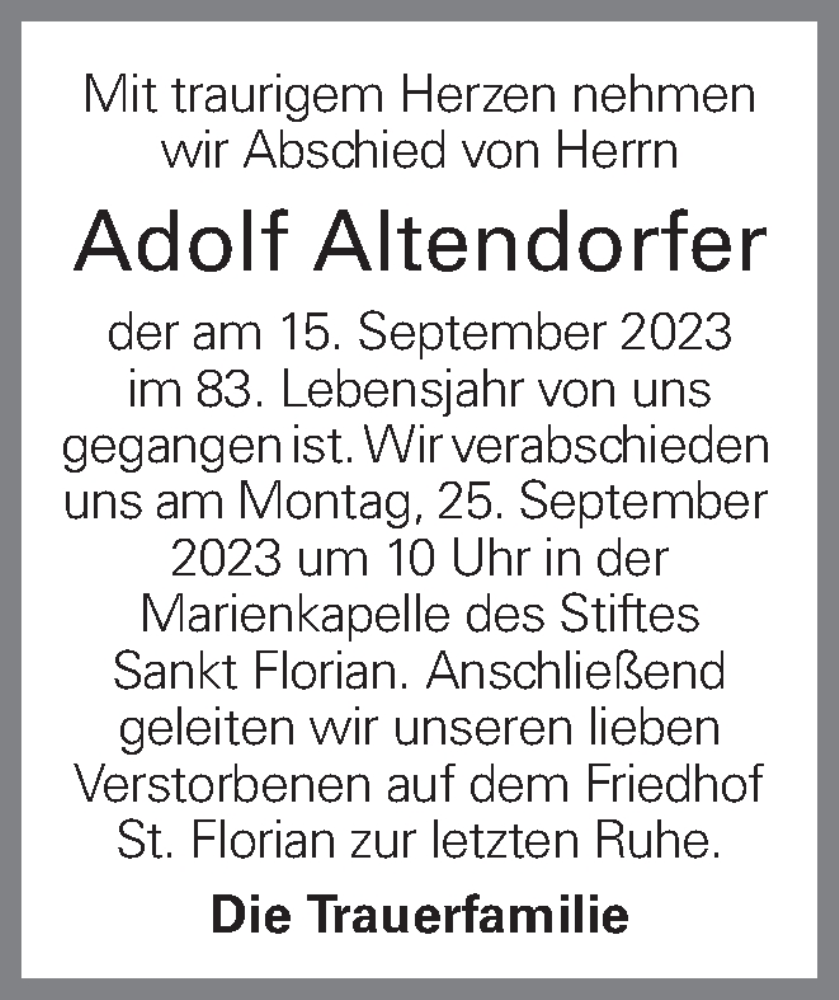 Hier finden Sie alle Traueranzeigen aus der Zeitung, die bisher für Adolf Altendorfer erschienen sind. Weitere Traueranzeigen, die in der Zeitung erscheinen, werden hier ebenfalls aufgelistet