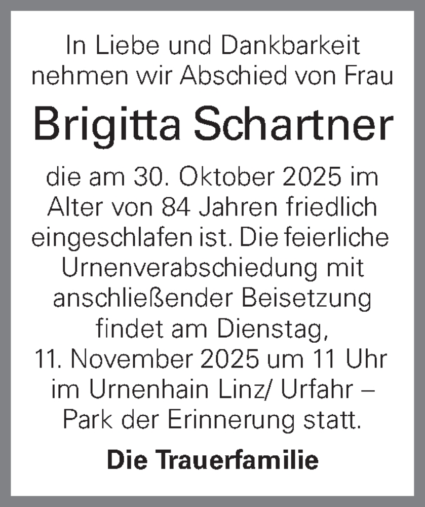 Hier finden Sie alle Traueranzeigen aus der Zeitung, die bisher für Brigitta Schartner erschienen sind. Weitere Traueranzeigen, die in der Zeitung erscheinen, werden hier ebenfalls aufgelistet