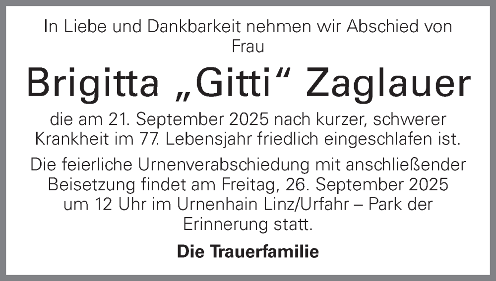 Hier finden Sie alle Traueranzeigen aus der Zeitung, die bisher für Brigitta Zaglauer erschienen sind. Weitere Traueranzeigen, die in der Zeitung erscheinen, werden hier ebenfalls aufgelistet