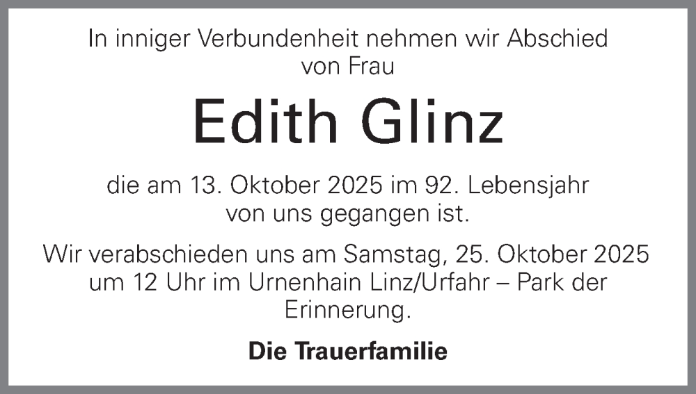 Hier finden Sie alle Traueranzeigen aus der Zeitung, die bisher für Edith Glinz erschienen sind. Weitere Traueranzeigen, die in der Zeitung erscheinen, werden hier ebenfalls aufgelistet