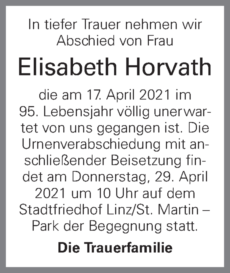Hier finden Sie alle Traueranzeigen aus der Zeitung, die bisher für Elisabeth Horvath erschienen sind. Weitere Traueranzeigen, die in der Zeitung erscheinen, werden hier ebenfalls aufgelistet