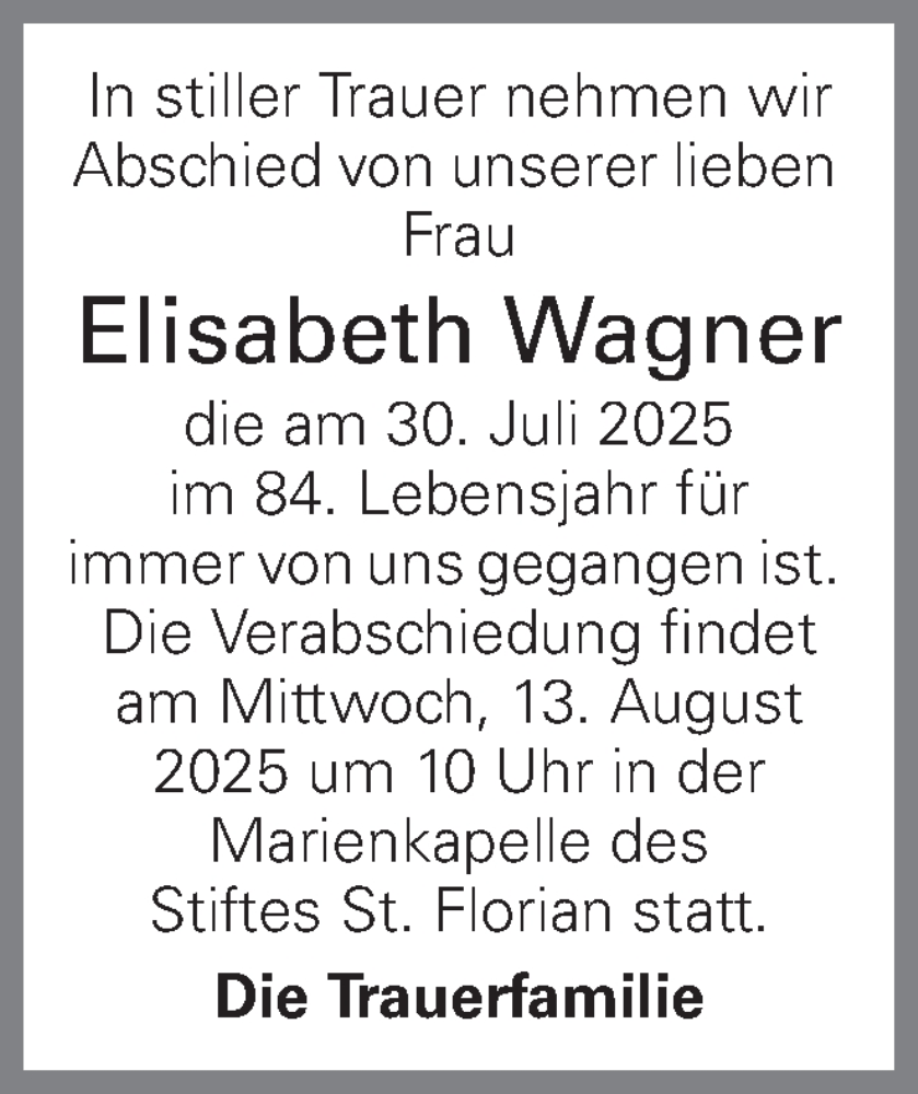 Hier finden Sie alle Traueranzeigen aus der Zeitung, die bisher für Elisabeth Wagner erschienen sind. Weitere Traueranzeigen, die in der Zeitung erscheinen, werden hier ebenfalls aufgelistet