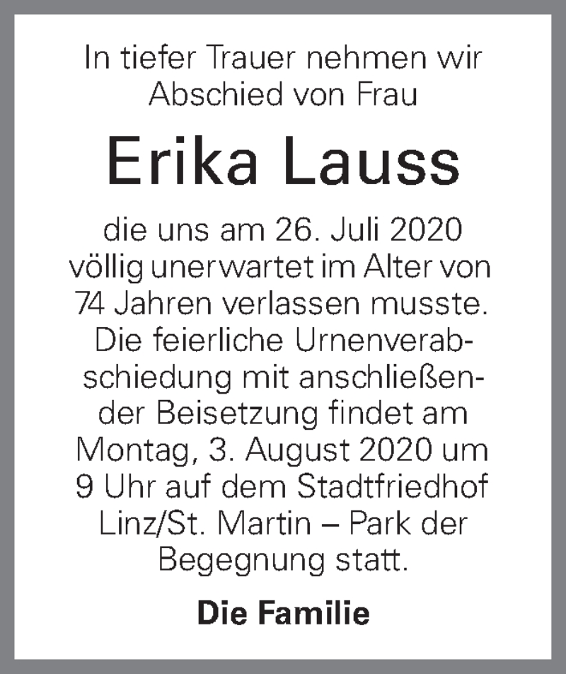 Hier finden Sie alle Traueranzeigen aus der Zeitung, die bisher für Erika Lauss erschienen sind. Weitere Traueranzeigen, die in der Zeitung erscheinen, werden hier ebenfalls aufgelistet