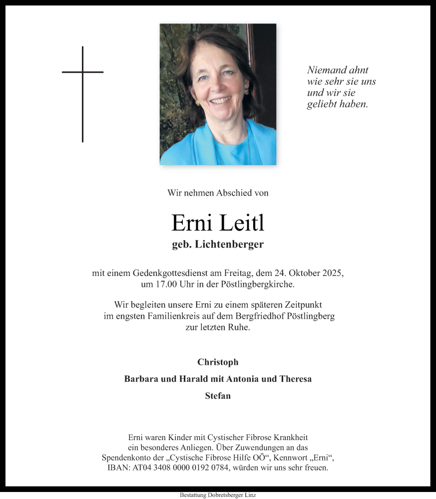 Hier finden Sie alle Traueranzeigen aus der Zeitung, die bisher für Erni Leitl erschienen sind. Weitere Traueranzeigen, die in der Zeitung erscheinen, werden hier ebenfalls aufgelistet