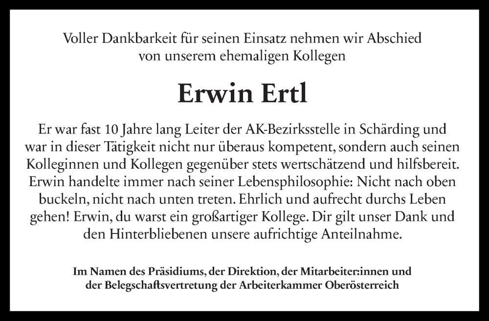 Hier finden Sie alle Traueranzeigen aus der Zeitung, die bisher für Erwin Ertl erschienen sind. Weitere Traueranzeigen, die in der Zeitung erscheinen, werden hier ebenfalls aufgelistet