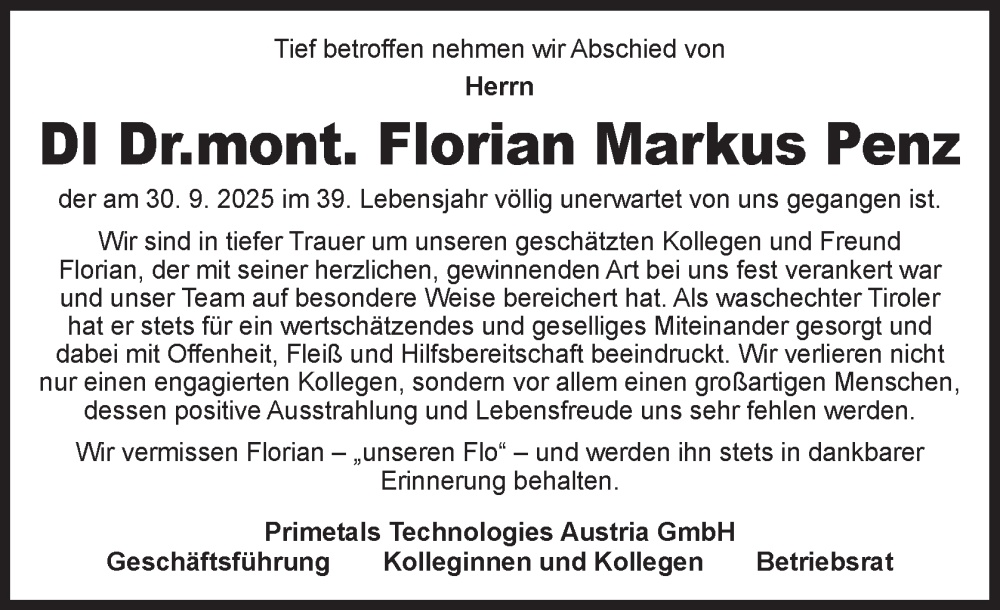 Hier finden Sie alle Traueranzeigen aus der Zeitung, die bisher für Florian Markus Penz erschienen sind. Weitere Traueranzeigen, die in der Zeitung erscheinen, werden hier ebenfalls aufgelistet