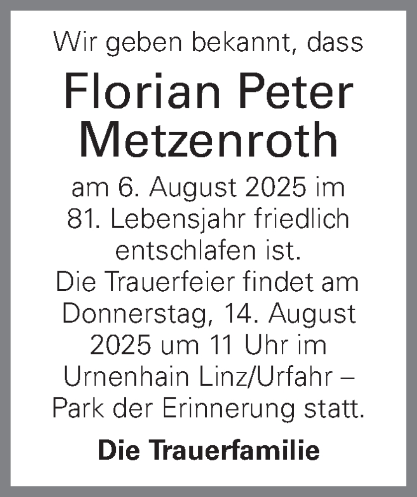 Hier finden Sie alle Traueranzeigen aus der Zeitung, die bisher für Florian Peter Metzenroth erschienen sind. Weitere Traueranzeigen, die in der Zeitung erscheinen, werden hier ebenfalls aufgelistet