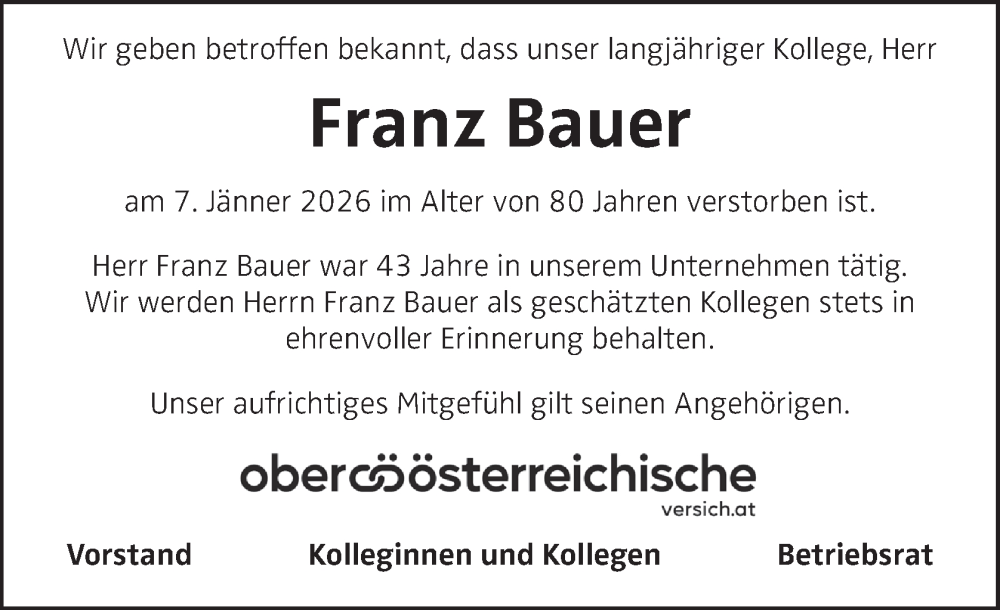 Hier finden Sie alle Traueranzeigen aus der Zeitung, die bisher für Franz Bauer erschienen sind. Weitere Traueranzeigen, die in der Zeitung erscheinen, werden hier ebenfalls aufgelistet