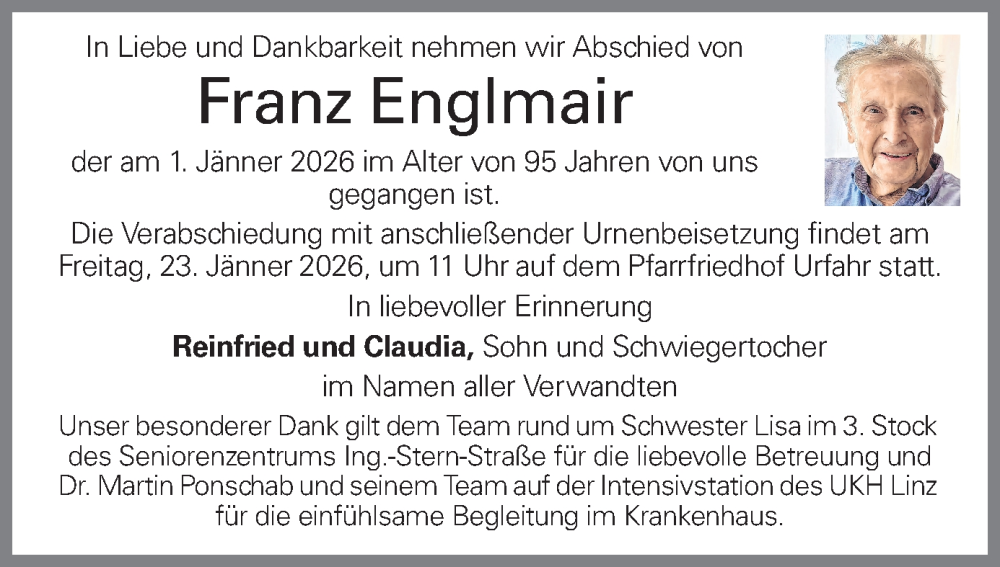 Hier finden Sie alle Traueranzeigen aus der Zeitung, die bisher für Franz Englmair erschienen sind. Weitere Traueranzeigen, die in der Zeitung erscheinen, werden hier ebenfalls aufgelistet