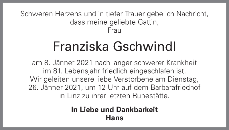 Hier finden Sie alle Traueranzeigen aus der Zeitung, die bisher für Franziska Gschwindl erschienen sind. Weitere Traueranzeigen, die in der Zeitung erscheinen, werden hier ebenfalls aufgelistet