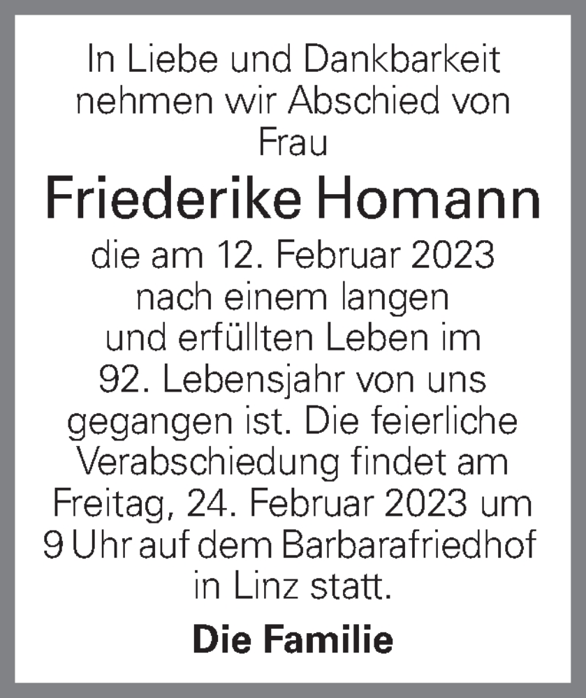 Hier finden Sie alle Traueranzeigen aus der Zeitung, die bisher für Friederike Homann erschienen sind. Weitere Traueranzeigen, die in der Zeitung erscheinen, werden hier ebenfalls aufgelistet