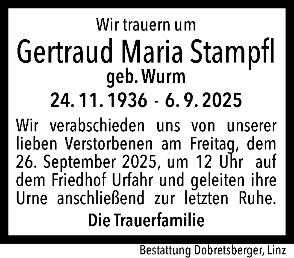 Hier finden Sie alle Traueranzeigen aus der Zeitung, die bisher für Gertraud Maria Stampfl erschienen sind. Weitere Traueranzeigen, die in der Zeitung erscheinen, werden hier ebenfalls aufgelistet