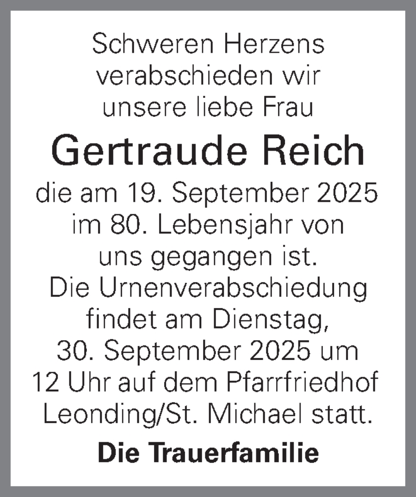 Hier finden Sie alle Traueranzeigen aus der Zeitung, die bisher für Gertraude Reich erschienen sind. Weitere Traueranzeigen, die in der Zeitung erscheinen, werden hier ebenfalls aufgelistet