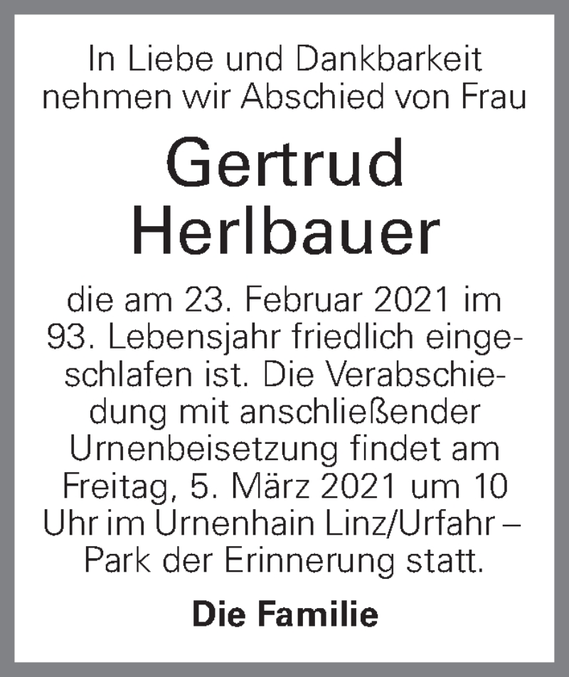 Hier finden Sie alle Traueranzeigen aus der Zeitung, die bisher für Gertrud Herlbauer erschienen sind. Weitere Traueranzeigen, die in der Zeitung erscheinen, werden hier ebenfalls aufgelistet