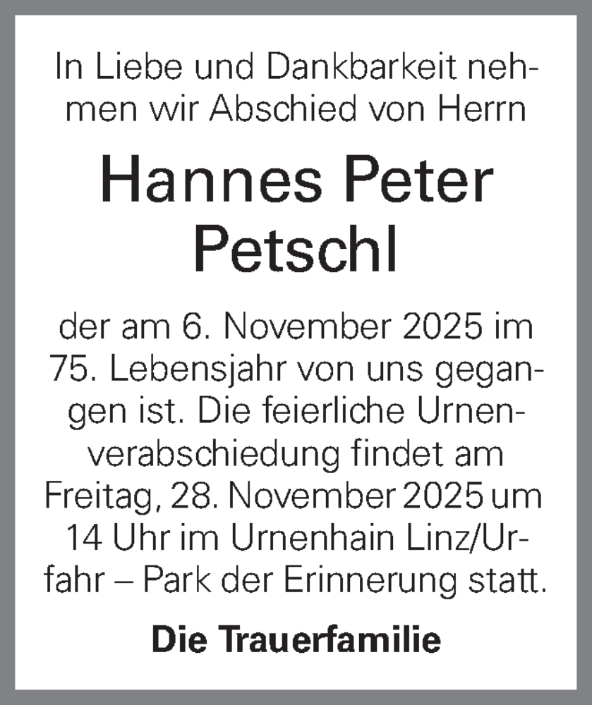 Hier finden Sie alle Traueranzeigen aus der Zeitung, die bisher für Hannes Peter Petschl erschienen sind. Weitere Traueranzeigen, die in der Zeitung erscheinen, werden hier ebenfalls aufgelistet