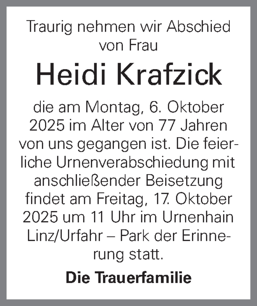 Hier finden Sie alle Traueranzeigen aus der Zeitung, die bisher für Heidi Krafzick erschienen sind. Weitere Traueranzeigen, die in der Zeitung erscheinen, werden hier ebenfalls aufgelistet