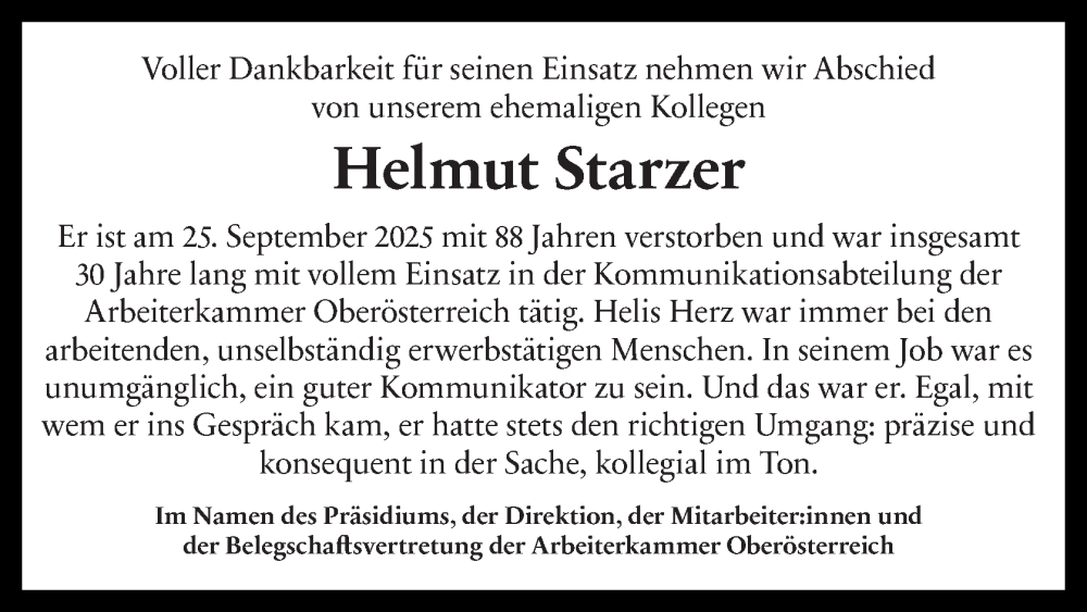 Hier finden Sie alle Traueranzeigen aus der Zeitung, die bisher für Helmut Starzer erschienen sind. Weitere Traueranzeigen, die in der Zeitung erscheinen, werden hier ebenfalls aufgelistet