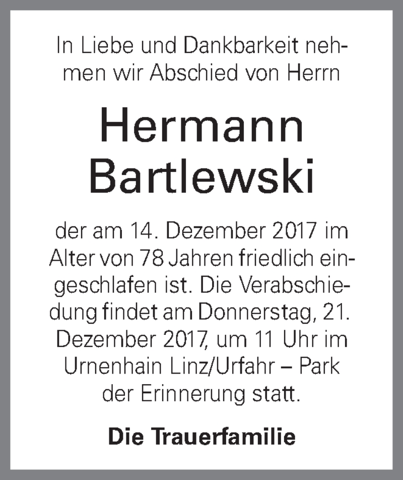 Hier finden Sie alle Traueranzeigen aus der Zeitung, die bisher für Hermann Bartlewski erschienen sind. Weitere Traueranzeigen, die in der Zeitung erscheinen, werden hier ebenfalls aufgelistet