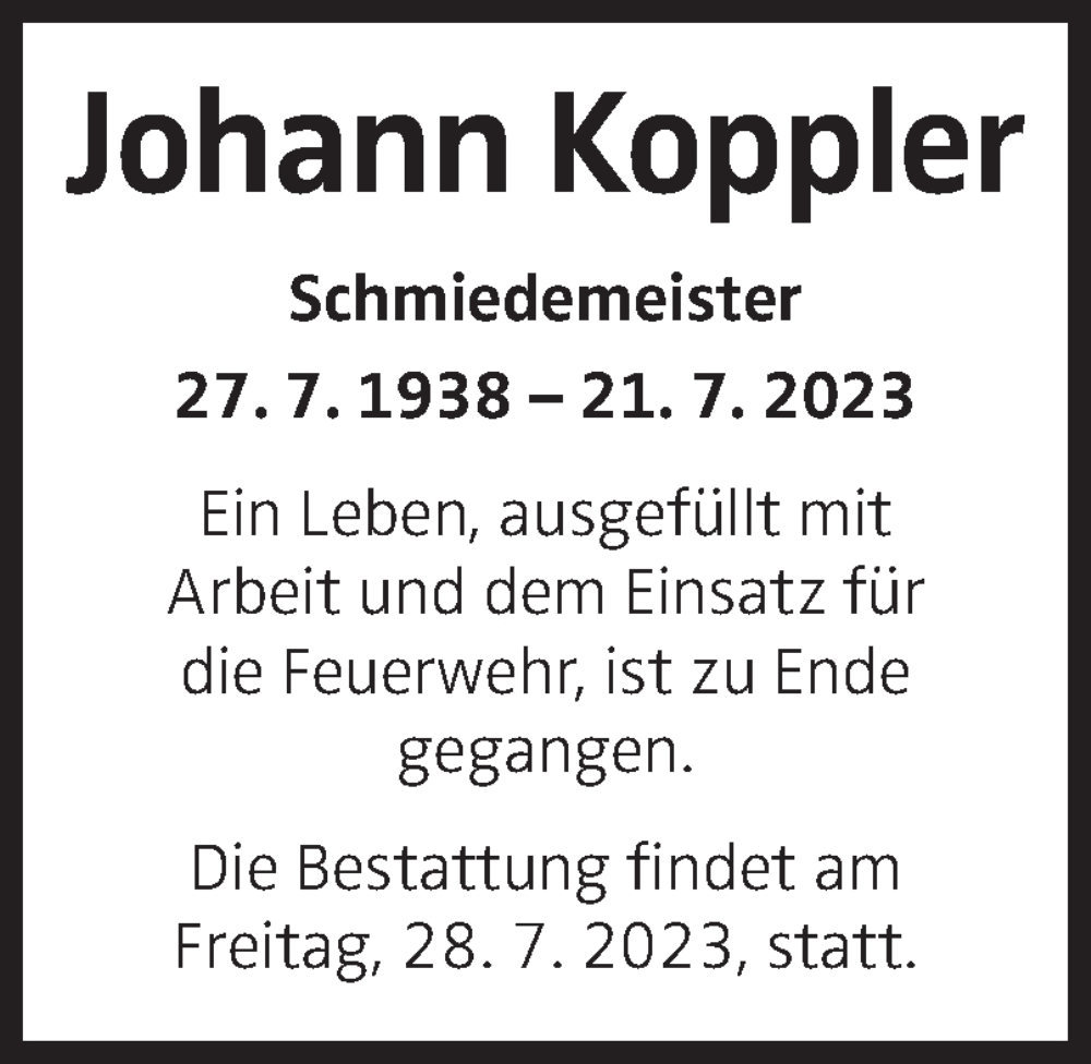Hier finden Sie alle Traueranzeigen aus der Zeitung, die bisher für Johann Koppler erschienen sind. Weitere Traueranzeigen, die in der Zeitung erscheinen, werden hier ebenfalls aufgelistet