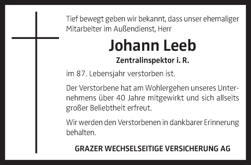 Hier finden Sie alle Traueranzeigen aus der Zeitung, die bisher für Johann Leeb erschienen sind. Weitere Traueranzeigen, die in der Zeitung erscheinen, werden hier ebenfalls aufgelistet