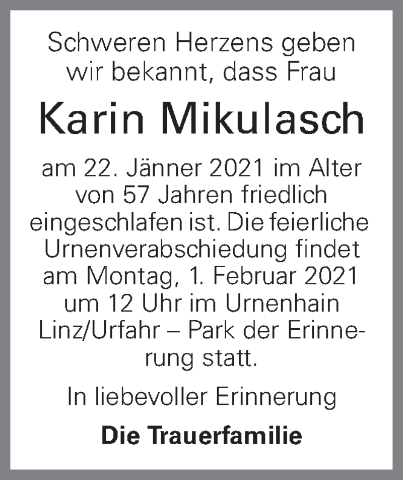 Hier finden Sie alle Traueranzeigen aus der Zeitung, die bisher für Karin Mikulasch erschienen sind. Weitere Traueranzeigen, die in der Zeitung erscheinen, werden hier ebenfalls aufgelistet