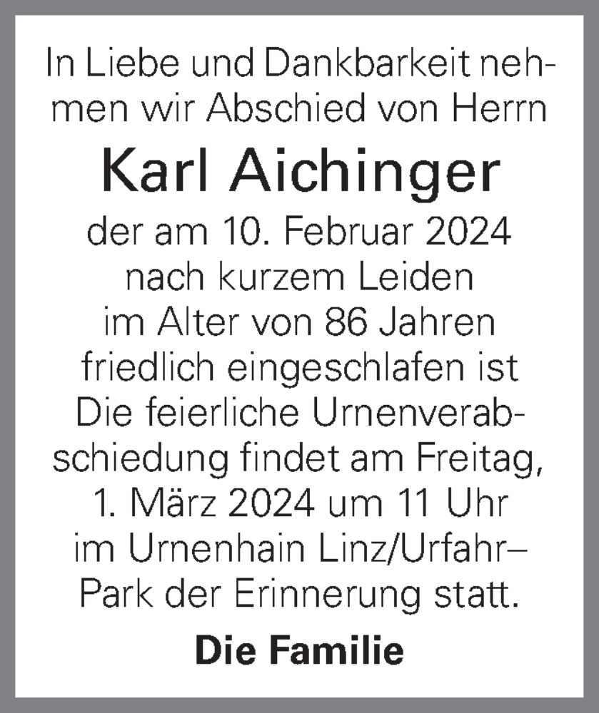 Hier finden Sie alle Traueranzeigen aus der Zeitung, die bisher für Karl Aichinger erschienen sind. Weitere Traueranzeigen, die in der Zeitung erscheinen, werden hier ebenfalls aufgelistet