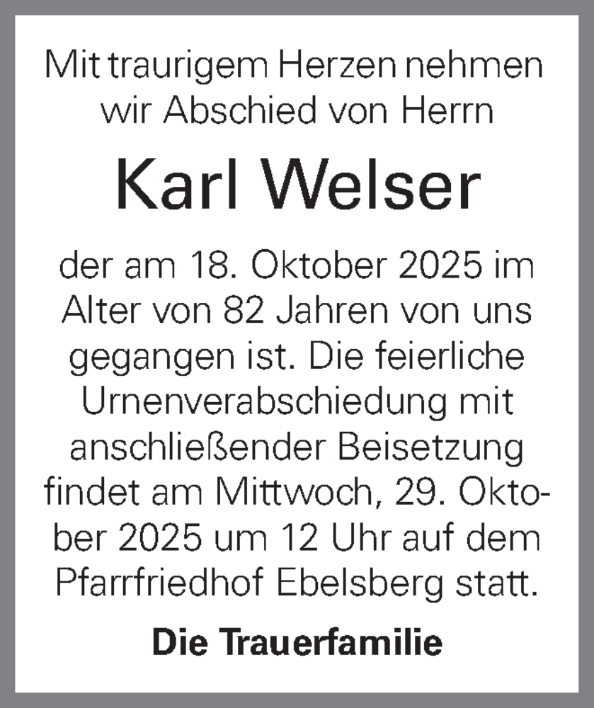 Hier finden Sie alle Traueranzeigen aus der Zeitung, die bisher für Karl Welser erschienen sind. Weitere Traueranzeigen, die in der Zeitung erscheinen, werden hier ebenfalls aufgelistet