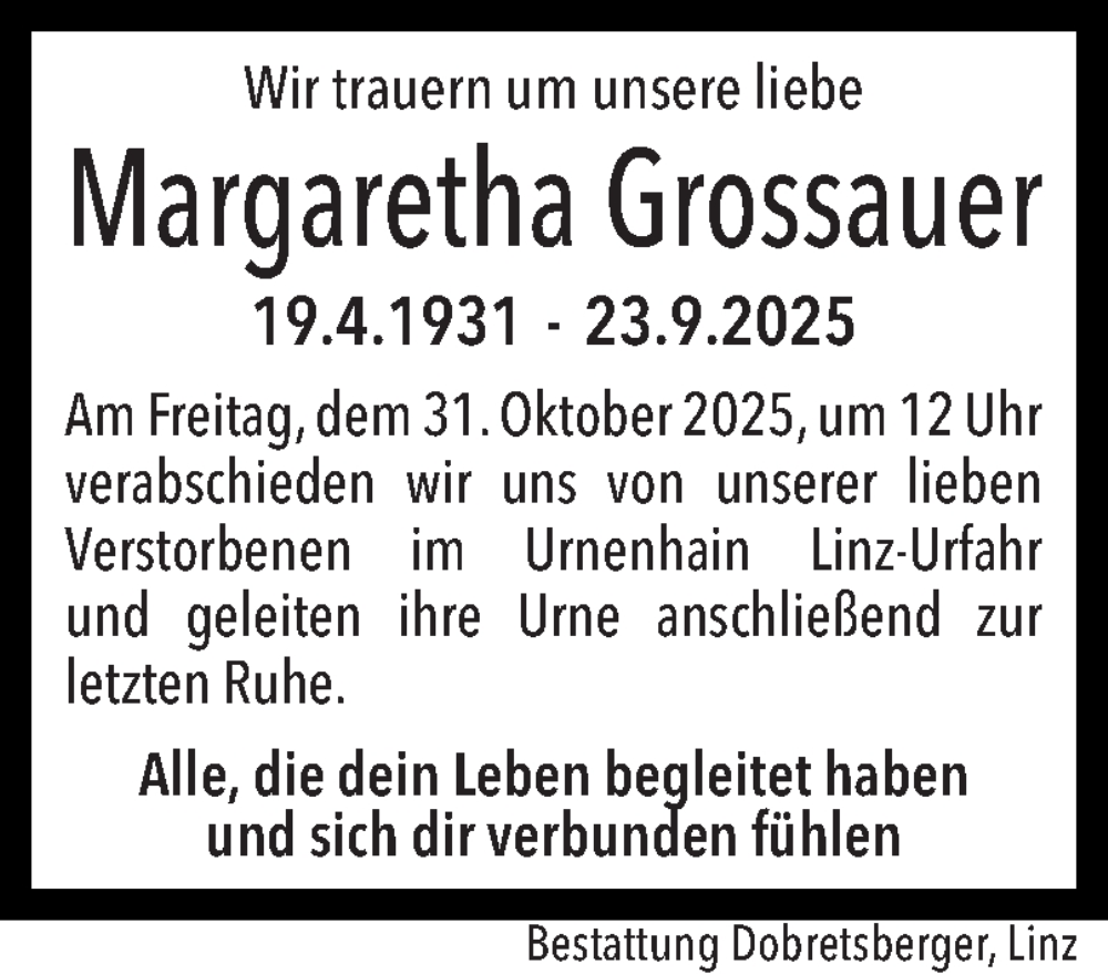 Hier finden Sie alle Traueranzeigen aus der Zeitung, die bisher für Margaretha Grossauer erschienen sind. Weitere Traueranzeigen, die in der Zeitung erscheinen, werden hier ebenfalls aufgelistet