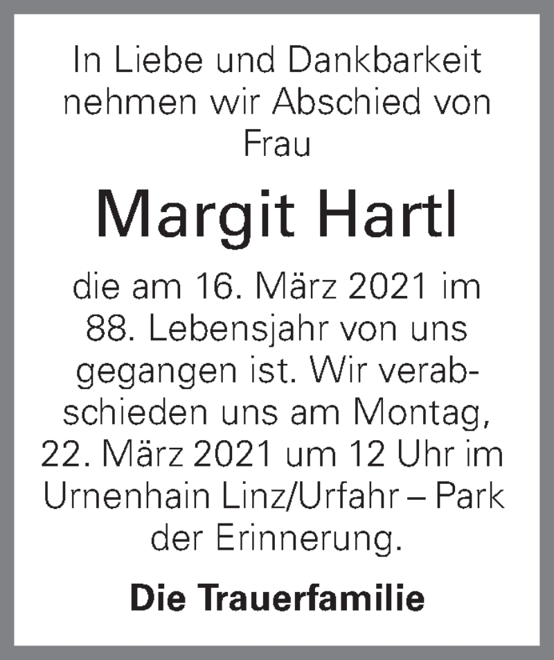 Hier finden Sie alle Traueranzeigen aus der Zeitung, die bisher für Margit Hartl erschienen sind. Weitere Traueranzeigen, die in der Zeitung erscheinen, werden hier ebenfalls aufgelistet