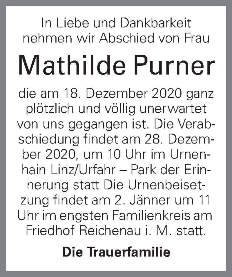 Hier finden Sie alle Traueranzeigen aus der Zeitung, die bisher für Mathilde Purner erschienen sind. Weitere Traueranzeigen, die in der Zeitung erscheinen, werden hier ebenfalls aufgelistet
