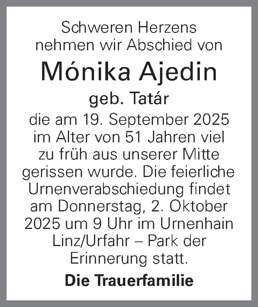 Hier finden Sie alle Traueranzeigen aus der Zeitung, die bisher für Mónika Ajedin erschienen sind. Weitere Traueranzeigen, die in der Zeitung erscheinen, werden hier ebenfalls aufgelistet