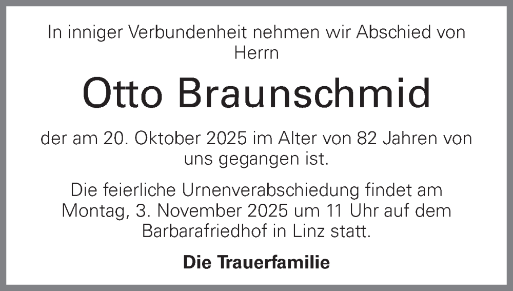 Hier finden Sie alle Traueranzeigen aus der Zeitung, die bisher für Otto Braunschmid erschienen sind. Weitere Traueranzeigen, die in der Zeitung erscheinen, werden hier ebenfalls aufgelistet