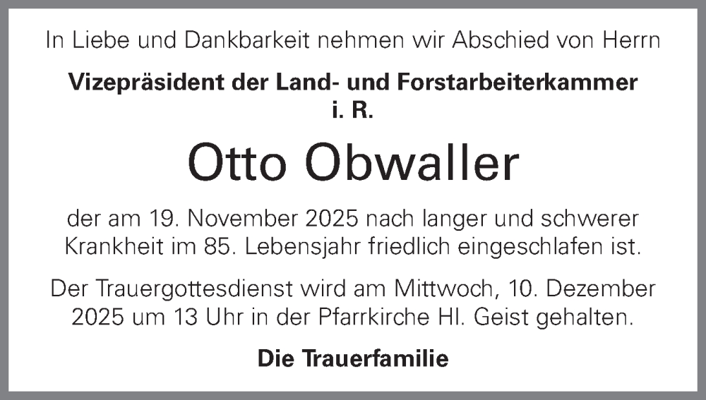 Hier finden Sie alle Traueranzeigen aus der Zeitung, die bisher für Otto Obwaller erschienen sind. Weitere Traueranzeigen, die in der Zeitung erscheinen, werden hier ebenfalls aufgelistet
