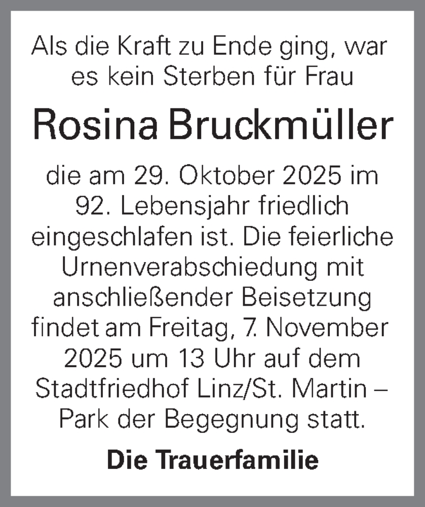 Hier finden Sie alle Traueranzeigen aus der Zeitung, die bisher für Rosina Bruckmüller erschienen sind. Weitere Traueranzeigen, die in der Zeitung erscheinen, werden hier ebenfalls aufgelistet