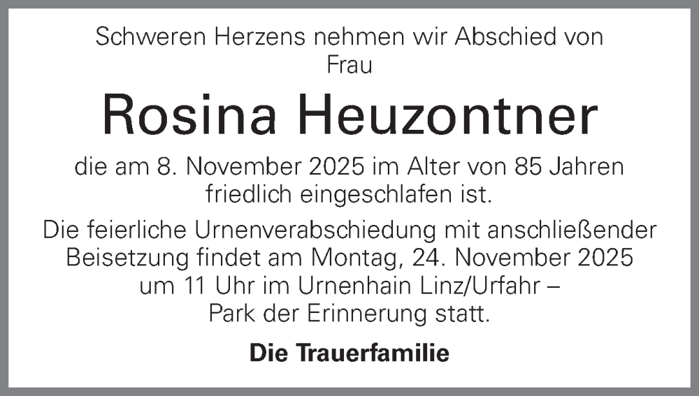 Hier finden Sie alle Traueranzeigen aus der Zeitung, die bisher für Rosina Heuzontner erschienen sind. Weitere Traueranzeigen, die in der Zeitung erscheinen, werden hier ebenfalls aufgelistet