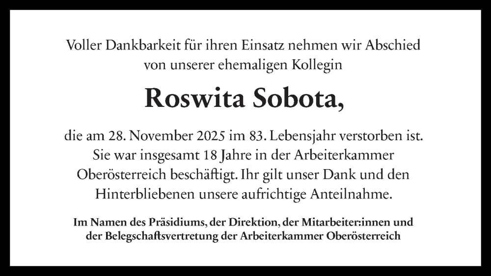 Hier finden Sie alle Traueranzeigen aus der Zeitung, die bisher für Roswita Sobota erschienen sind. Weitere Traueranzeigen, die in der Zeitung erscheinen, werden hier ebenfalls aufgelistet