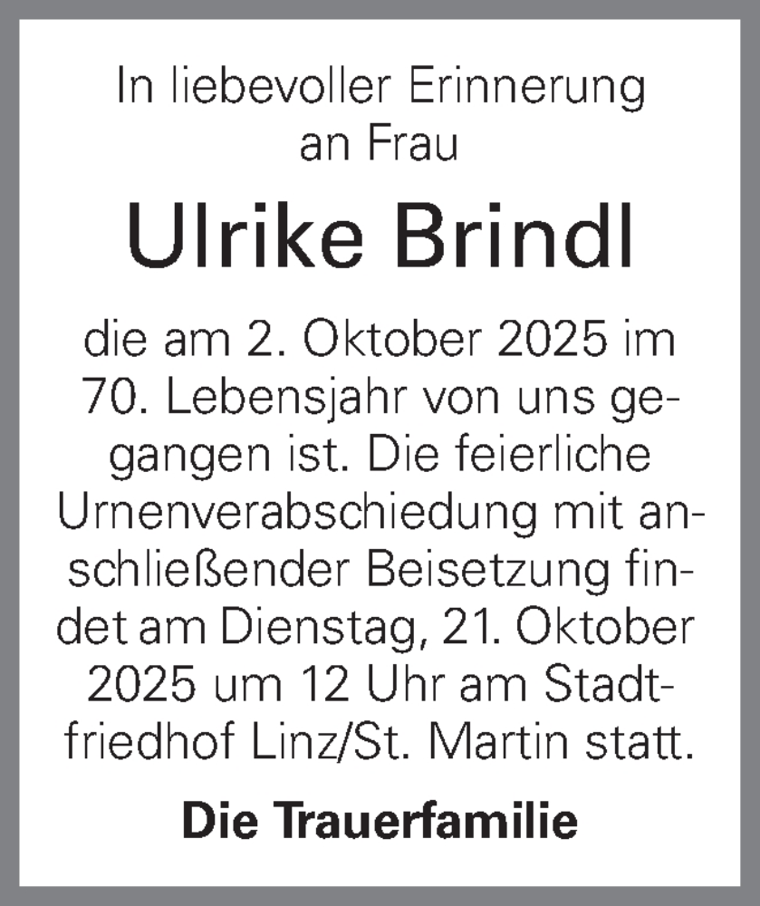 Hier finden Sie alle Traueranzeigen aus der Zeitung, die bisher für Ulrike Brindl erschienen sind. Weitere Traueranzeigen, die in der Zeitung erscheinen, werden hier ebenfalls aufgelistet