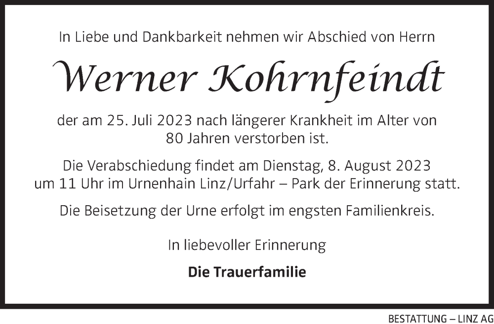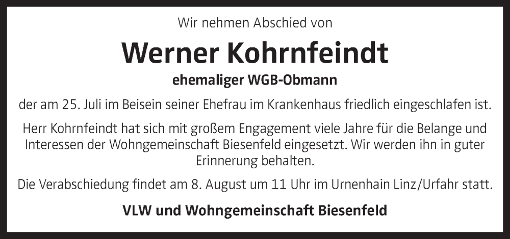 Hier finden Sie alle Traueranzeigen aus der Zeitung, die bisher für Werner Kohrnfeindt erschienen sind. Weitere Traueranzeigen, die in der Zeitung erscheinen, werden hier ebenfalls aufgelistet