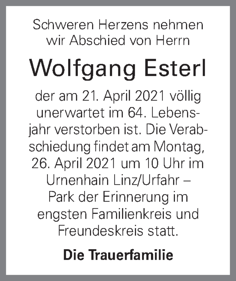 Hier finden Sie alle Traueranzeigen aus der Zeitung, die bisher für Wolfgang Esterl erschienen sind. Weitere Traueranzeigen, die in der Zeitung erscheinen, werden hier ebenfalls aufgelistet